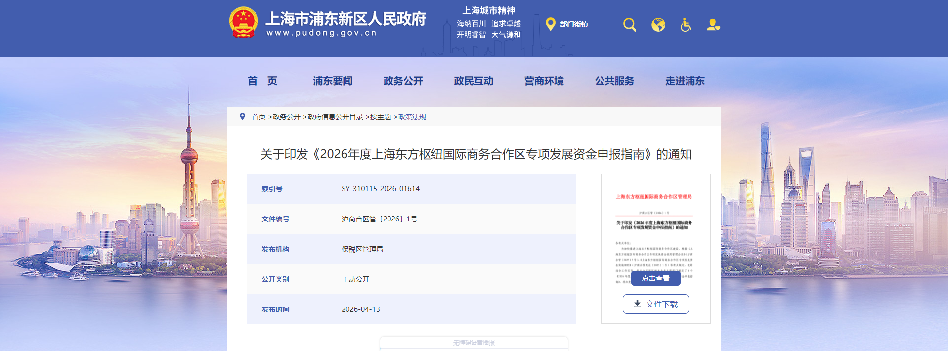 为加快推进上海东方枢纽国际商务合作区建设,根据《上海东方枢纽国际商务合作区专项发展资金使用管理办法》(沪商合管〔2025〕5号)、《上海东方枢纽国际商务合作区专项发展资金实施细则》(沪商合管规范〔2025〕1号)等有关规定,
