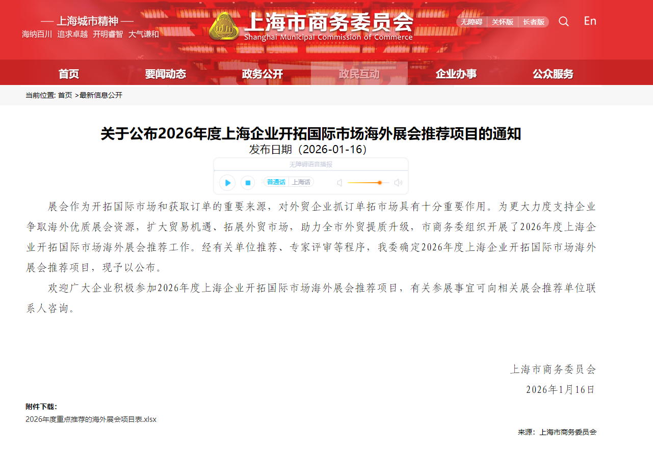 展会作为开拓国际市场和获取订单的重要来源,对外贸企业抓订单拓市场具有十分重要作用。为更大力度支持企业争取海外优质展会资源,扩大贸易机遇、拓展外贸市场,助力全市外贸提质升级,市商务委组织开展了2026年度上海企业开拓国际市场海外展会推荐工作。
