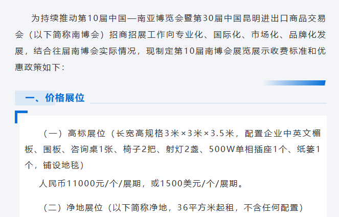 为持续推动第10届中国—南亚博览会暨第30届中国昆明进出口商品交易会(以下简称南博会)招商招展工作向专业化、国际化、市场化、品牌化发展,结合往届南博会实际情况,现制定第10届南博会展览展示收费标准和优惠政策如下: