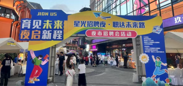 7月11日晚,贵阳市云岩区太平路玖仓小广场人潮涌动,由贵州省就业局、贵州省人才大市场、贵阳市人力资源和社会保障局、云岩区委组织部主办,云岩区人力资源和社会保障局、云岩区毓秀路街道办事处、贵州兴黔一览数字人才服务有限公司承办的“育见未来 夜启新程”星光招聘夜•职达未来路夜市招聘会活动,在此热闹开市。