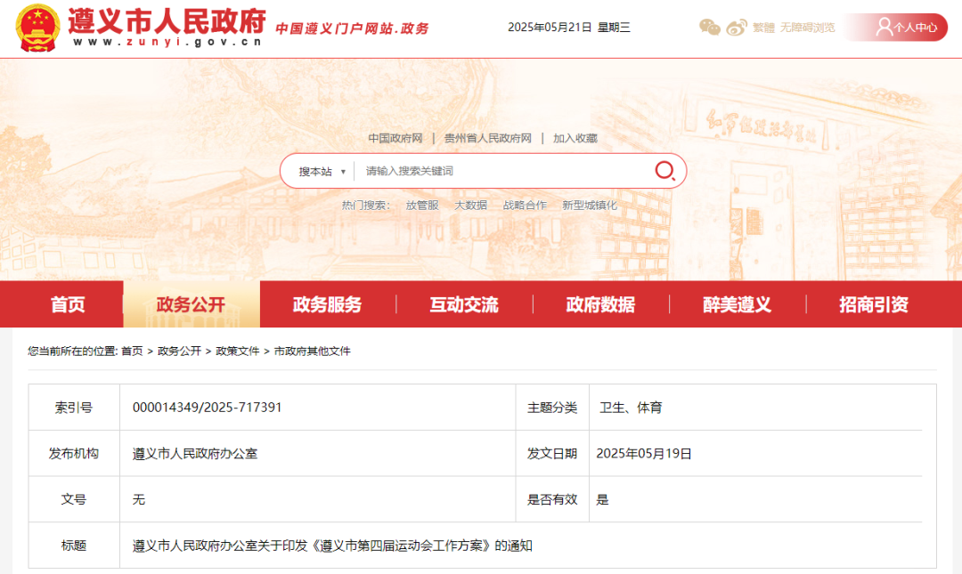 近日遵义市人民政府办公室印发《遵义市第四届运动会工作方案》的通知比赛时间、地点、项目等已确定