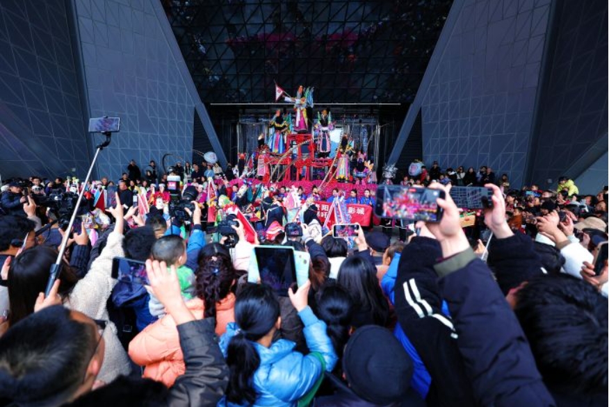 3月9日,国家级非物质文化遗产——安顺地戏亮相贵阳越界影城,来自安顺的表演团队演出剧目《封神演义之哪吒闹海》。当戴着面具的哪吒和敖丙等角色出现在越界影城时,影迷纷纷拿出手机拍个不停。与此同时,影城内的IMAX-GT厅正在放映《哪吒2》,“地戏哪吒”与“动画哪吒”联袂演出,为现场影迷带来了丰富多样的观影体验。