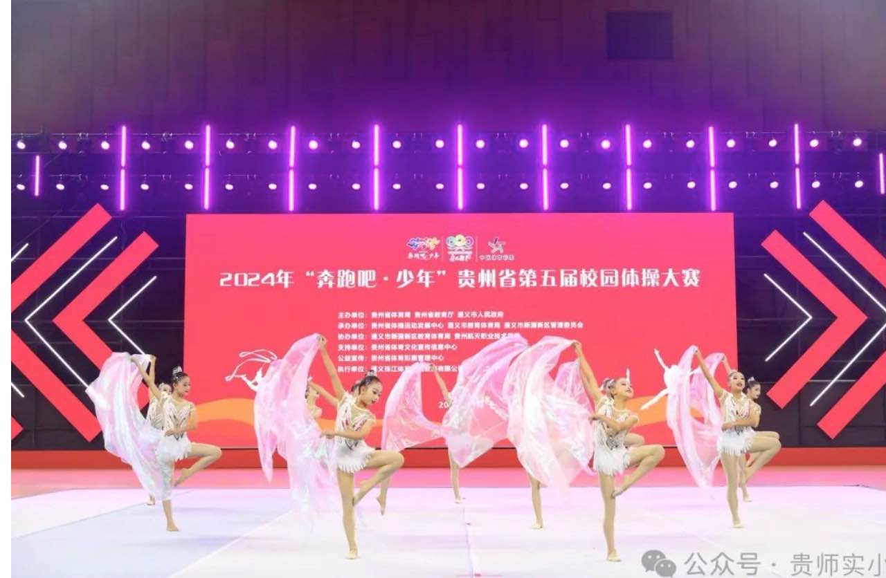 2024年11月22日—27日,由贵州省教育厅主办,贵州省遵义市教育体育局协办的“贵州省第五届校园体操大赛”在遵义市奥体中心隆重举行。本次比赛从幼儿园涵盖到大学,来自全省的292支队伍参加了此次比赛。贵阳市师范学校附属实验小学啦啦操规定动作、啦啦操自选动作和艺术体操三支队伍获小学组一等奖。