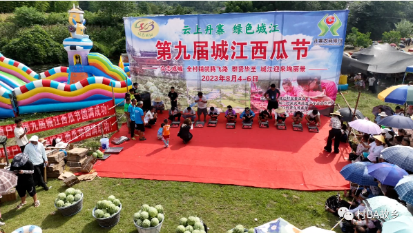 丹寨县兴仁镇城江村的村民们在家门口举办了第九届城江西瓜节,吸引了近万名游客前来观光,村民们欢跳芦笙舞,还举行吃西瓜比赛,以此庆祝一年一度的西瓜丰收季。