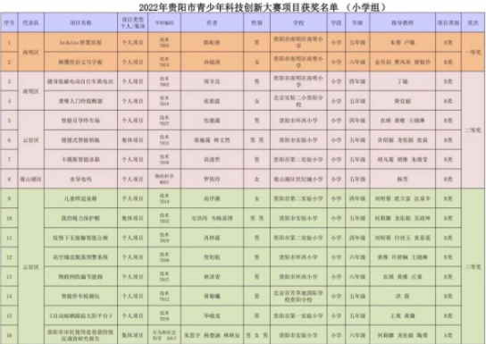 2023 年 1 月 7 日,2022 年贵阳市青少年科技创新大赛按照大赛章程及规则已顺利完成终评。各区(市、县)在进行预选的基础上,共推荐了 188 项作品至市赛,选手在 " 青少年科技创新成果竞赛 ( 中学组、小学组 ) "" 科技辅导员科技教育创新成果竞赛 " 两大赛事中角逐,经过资格审查、初评和终评等环节,最终评选出 76 项获奖作品。