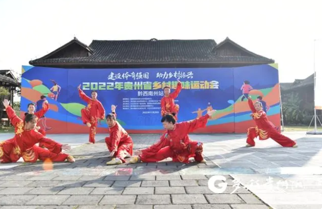 11月26日,2022年贵州省乡村趣味运动会(黔西南州站)在兴义市纳录村乡愁集市八音堂举办,来自黔西南州各市、县15支参赛队伍近400人参加活动。