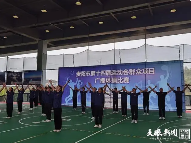 11月13日,由贵阳市人民政府主办,贵阳市体育局承办的贵阳市第十四届运动会群众项目广播体操比赛在贵阳中铁阅山湖篮球馆完赛。 比赛项目为第九套广播体操,来自贵阳市的一百余名运动员参赛。 早上10时30分,气温骤降,寒风呼啸,即使参赛选手身着短袖,他们也以饱满的精神状态蓄势待发,迎接此次广播体操比赛。比赛现场,参赛选手们身穿统一的服装,伴随着熟悉的广播声,动作舒展娴熟、节拍有力分明、姿势优美大方,充盈着刚健之美,洋溢着青春的气息与活力。