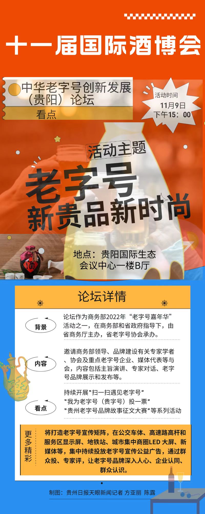 近日,记者从省政府新闻办召开的新闻发布会上获悉,第十一届中国(贵州)国际酒类博览会将于11月9日至12日在贵阳国际会议展览中心举行。期间,“中华老字号创新发展(贵阳)论坛”将于11月9日下午15:00在贵阳国际生态会议中心一楼B厅举办,并以“老字号新贵品新时尚”为主题持续开展今年“老字号嘉年华”系列活动。