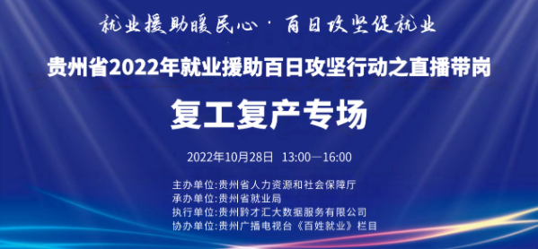 为帮助市场主体纾困解难,强化公共就业服务促就业,10月28日,贵州省人力资源和社会保障厅将开展贵州省2022年就业援助百日攻坚行动之直播带岗(复工复产专场)活动,面向全省直播推介上万个就业岗位,满足各类不同求职人员的求职需求,保障企业用工稳定。