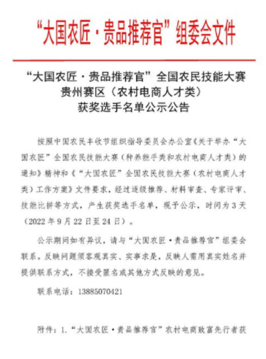 9月22日,由贵州省农业农村厅主办,贵州电子商务云运营有限责任公司承办的“大国农匠·贵品推荐官”全国农民技能大赛贵州赛区(农村电商人才类)经过逐级推荐、材料审查、专家评审、技能比拼等激烈角逐,本次大赛共评选农村电商致富先行者15名、农产品电商品牌筑造者14名、乡村星主播10名。