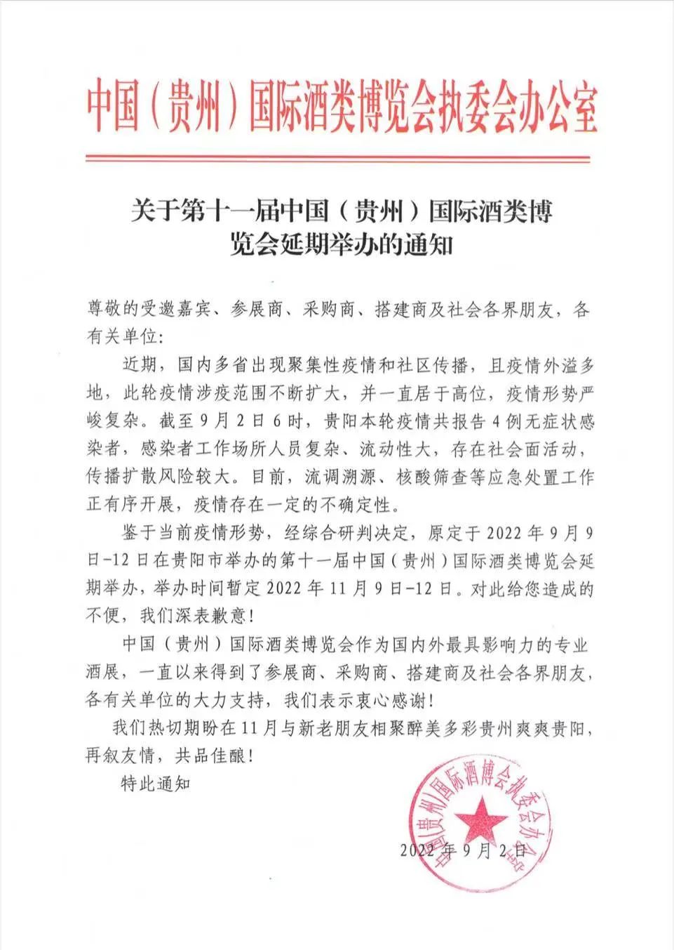 尊敬的受邀嘉宾、参展商、采购商、搭建商及社会各界朋友,各有关单位:近期,国内多省出现聚集性疫情和社区传播,且疫情外溢多地,此轮疫情涉疫范围不断扩大,并一直居于高位,疫情形势严峻复杂。截至9月2日6时,贵阳本轮疫情共报告 4例无症状感染者,感染者工作场所人员复杂、流动性大,存在社会面活动,传播扩散风险较大。目前,流调湖源、校酸筛查等应急处置工作正有序开展,疫情存在一定的不确定性。