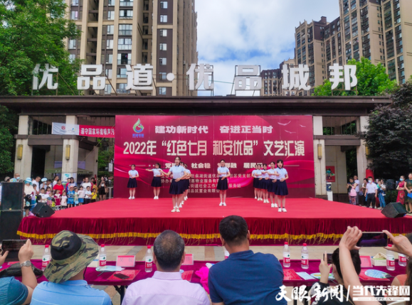 为庆祝中国共产党成立101周年,充分展现辖区居民奋发向上的时代风采,激发广大党员群众的爱国、爱党热情,引导辖区党员群众把爱党、爱国、爱社区融入实现“党建强,社会稳,党群融,居民乐”的建设目标中。 7月10日,贵阳市白云区优品城邦社区在社区文化广场上开展了主题为“红色七月 和安优品”的红色文艺汇演活动。街道主要领导、辖区企业负责人、党员代表、居民代表出席了本次活动,泉湖街道党工委书记曾庆德致开幕词,辖区党员、居民群众、社区志愿者等共计400余人参加活动。