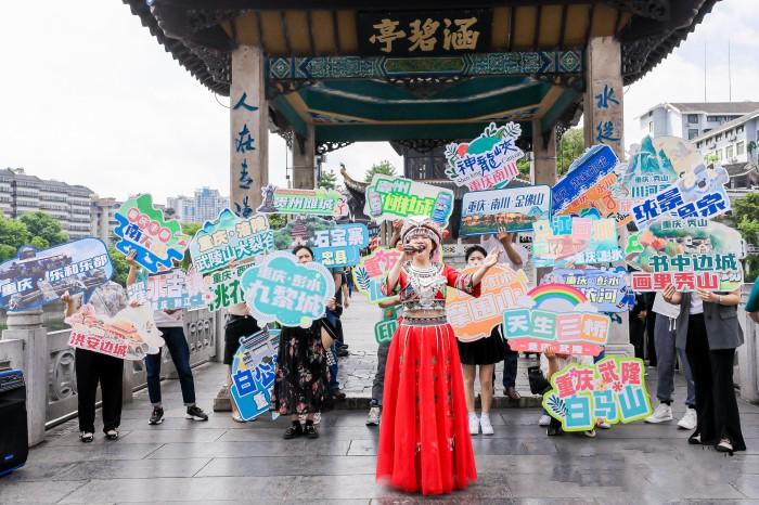 当天上午,一场独具黔渝特色的文艺快闪惊艳亮相贵阳甲秀楼。来自重庆和贵州傩城的歌舞演员们穿着独具地域特色的服装,带来了《唱山歌》《太阳出来喜洋洋》《土家迎客歌》《采薇》等节目,表演极具感染力,把重庆人民的乐观豪爽和热情好客展现得淋漓极致,围观市民纷纷拍照叫好。表演队伍中还有演员举着重庆大武陵各景区及贵州傩城手持牌,盛情邀约贵州游客打卡魔幻山城和秀美武陵,感受“最炫武陵风”。