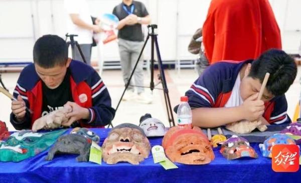 活动现场,在铜仁市特殊教育学校的展台上,一个个生动形象的傩面具在两位患有听力障碍的学生手中渐渐成型。