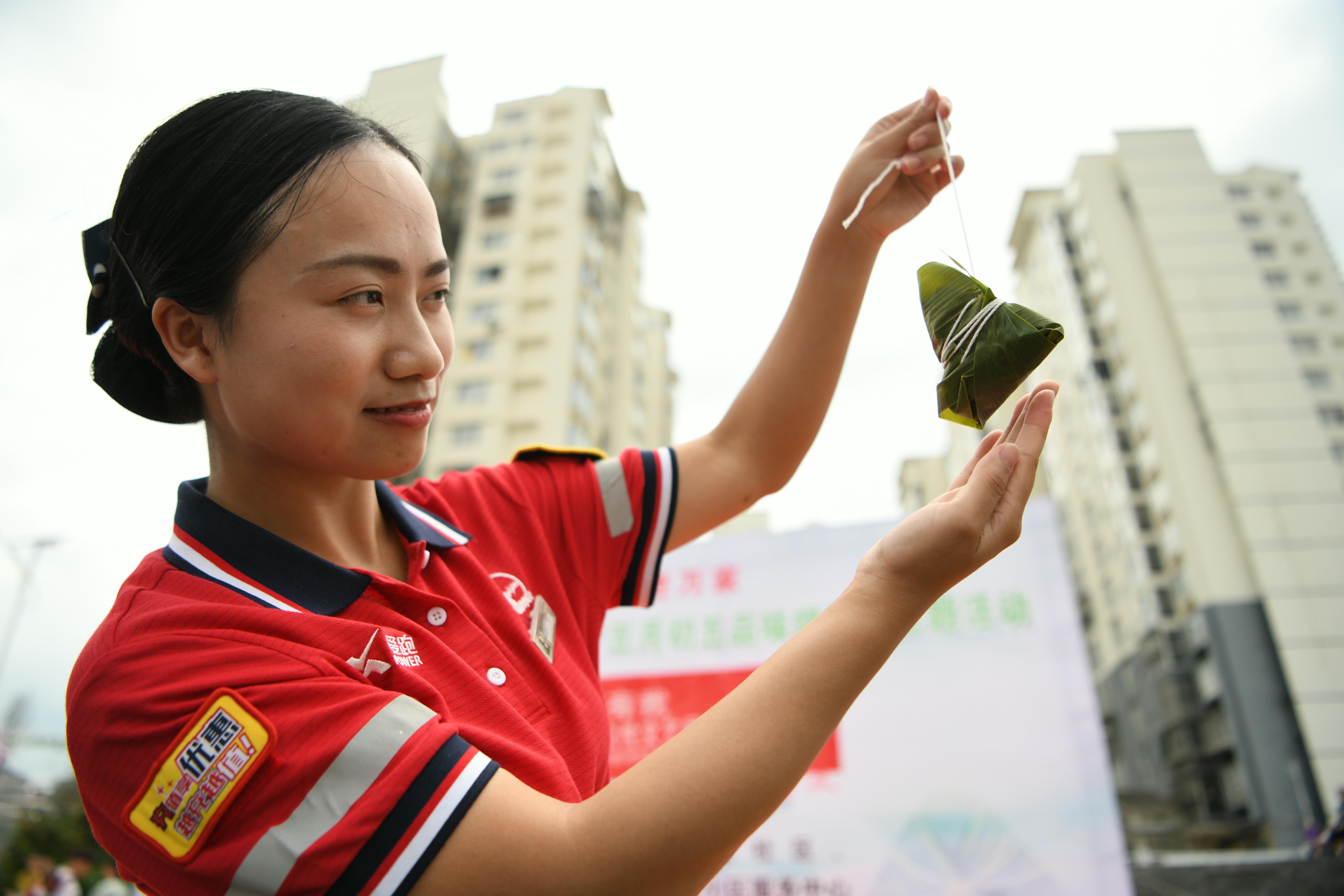 2023年6月18日,在凯里市西门街道办事处清江社区,一爱心企业员工在展示自己学包的粽子