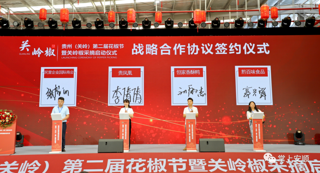活动现场,关岭花椒产业龙头企业贵州椒丰众鑫花椒产业发展有限公司相关负责人作关岭花椒产业发展规划及关岭椒产品介绍,并与贵州省民营经济国际合作商会、贵州龙承子秀商贸有限公司、贵凤凰(贵州)食品科技有限公司、安顺黔百味食品有限公司签订战略合作协议,与泽宁国际贸易(深圳)有限公司、贵州黔小民供应链管理有限公司、贵州鼎力调味品商贸公司、上海本巧实业有限公司签订经销商合作协议。