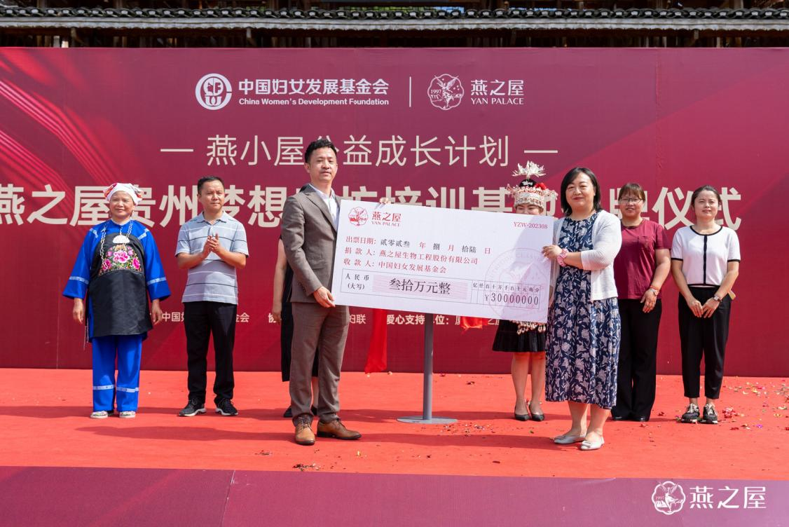 在所有嘉宾的见证下,黔东南州妇女联合会副主席李明群,贵州省高级工艺师、贵州省科技厅专家库专家、黔东南州苗侗服饰博物馆馆长杨建红,中国妇女发展基金会公众联络部高级主管刘穹琼,燕之屋品牌总监沈晓聪以及燕之屋“天才妈妈”贵州苗绣工坊主理人、贵州古苗疆工贸有限公司负责人刘英等领导嘉宾共同上台揭牌。随着红布揭落、礼花绽放,燕之屋贵州梦想工坊培训基地正式启动。活动还同步举行了捐赠仪式,燕之屋通过“燕小屋公益成长计划”向中国妇女发展基金会捐赠30万,定向支持贵州的妇女发展和非遗传承。中国妇女发展基金会公众联络部高级主管刘穹琼代表中国妇女发展基金会接受捐赠。