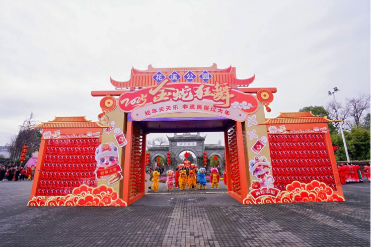 活动现场热闹非凡,花船巡游在波光粼粼的河面上精彩展开,伴随着《千年等一回》的旋律,白娘子和许仙的故事在花船上生动演绎。古风巡游的队伍身着华丽古装,穿梭于公园的各个角落,沿途与游客互动。戏曲表演的舞台前围满了观众,演员们以独特的唱腔和精湛的表演,带大家领略传统文化的韵味。非遗民俗表演中,舞龙舞狮热闹非凡,变脸喷火等绝技令人惊叹。金蛇迎春灯谜会现场,一盏盏红灯笼下悬挂着妙趣横生的谜题,游客们或驻足思考,或热烈讨论,沉浸在解谜的乐趣中。麟山和蛇山也热闹不已,人们纷纷登上麟山祈福,祈愿福泽降临、诸事顺遂;在蛇山寻找白娘子的身影,寓意健康平安、财源广进。