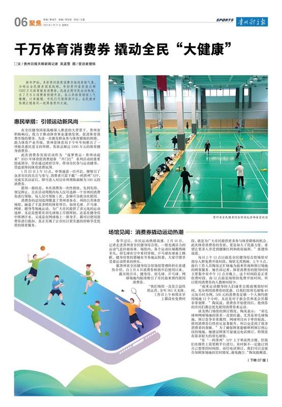 “我平时就特别喜欢打羽毛球,但场地费用确实是一笔不小的开支。有幸抢到了贵阳市区域的体育消费券,上周春节后首次来打球,尝试用体育消费券,没想到核销使用如此方便,最近可以更频繁地来打球,过足球瘾。”市民李先生笑着说。
