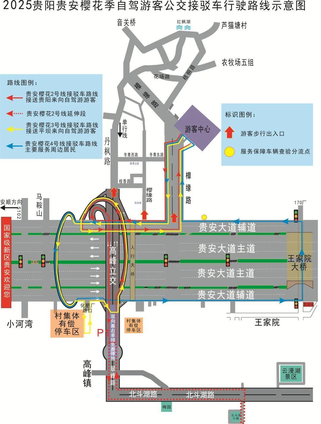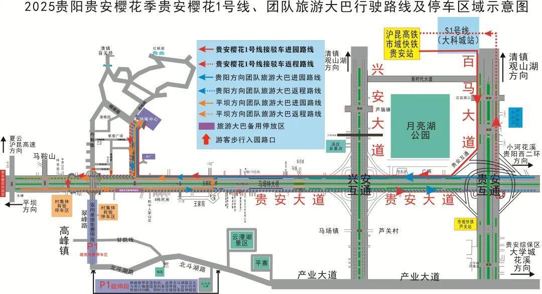 为确保2025年樱花季期间周边道路交通秩序,给赏樱游客留下美好的赏樱体验,根据花期时间,贵安新区交警部门将对贵安大道(马鞍山至马场特大桥双向)、翠峰路(原高峰大道)、樟缘路进行交通管制,管制措施主要是:将贵安大道马鞍山至马场特大桥双向中央开口进行临时封闭,使该路段主辅道不再互通,主道用于保障过境车辆正常通行,北侧辅道保障平坝农场内的居民、职工、樱花季公交接驳车进出园区,路侧均禁止停车,赏樱游客均通过公交接驳车或团队旅游大巴进出园区,确保贵安大道主道交通畅通。