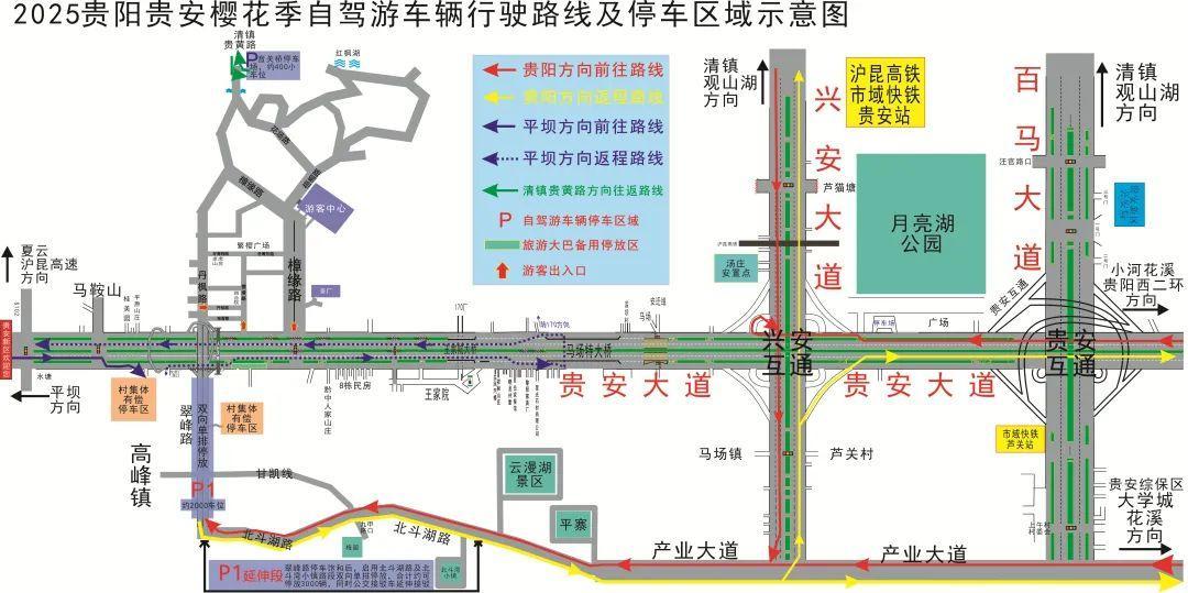 贵阳、清镇方向自驾的游客可通过贵安大道、兴安大道、产业大道、北斗湖路前往翠峰路临时停车区;