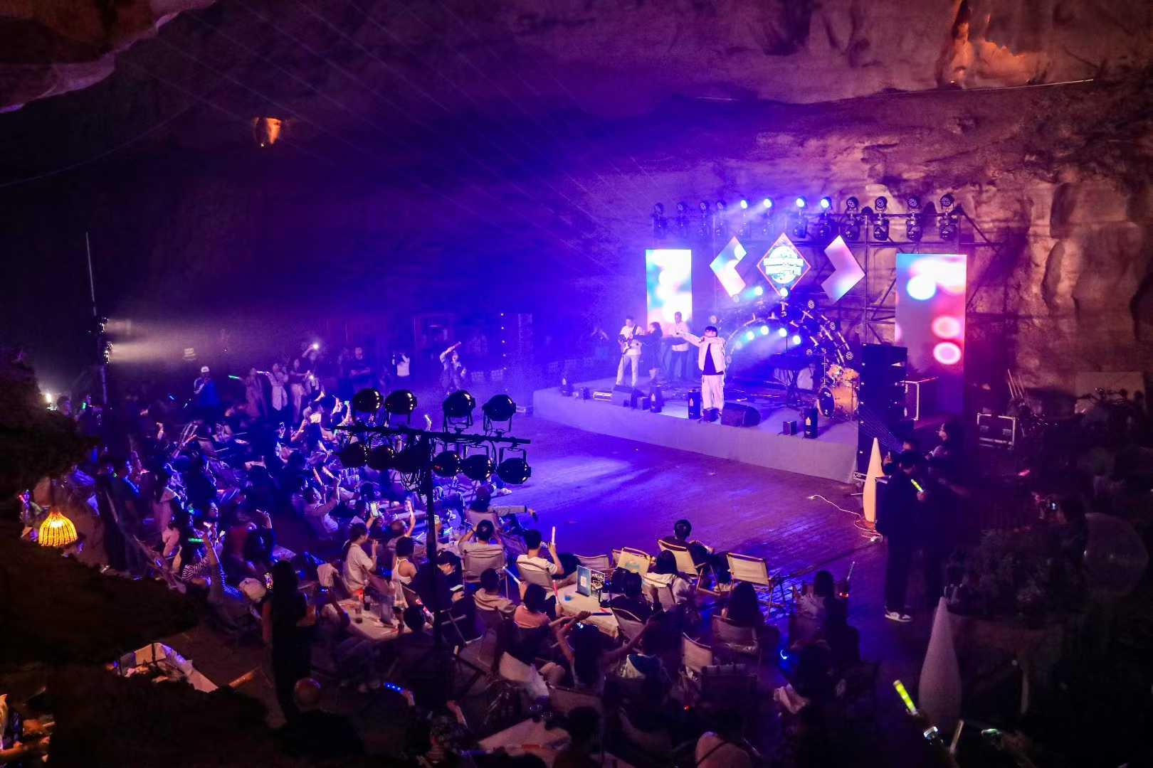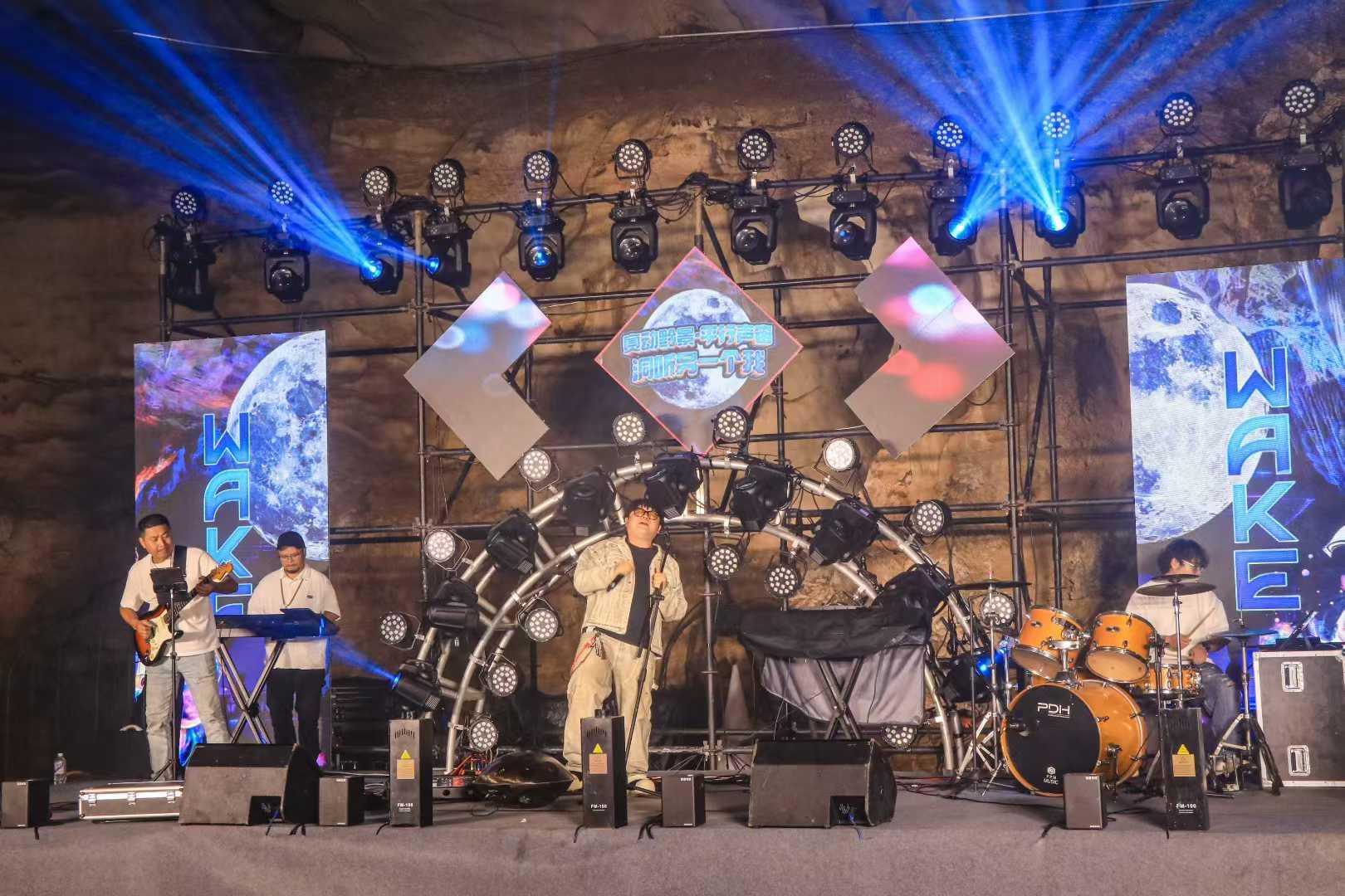 音乐节汇聚了四支风格迥异的乐队,为现场200名资深乐迷带来了持续不断的音乐冲击波。首先登场的“WAKE乐队”以高亢火热的摇滚曲《山海》迅速暖场,以其深邃酣畅又饱含力量的表演,瞬间拉近了与观众的距离。紧接着,“嶺乐队”则以流行朋克风格的原创歌曲为大家带来了耳目一新的舞台表演,展现了青春热情。接下来登场的老牌乐队“蓝刺乐队”则以罗大佑的经典歌曲登场,深情演绎了摇滚、灵魂、R&B等曲风。压轴登场的“夏日岛屿”乐队,则将现场气氛推向最高潮,他们带来的《Yelllow》《夜空中最亮的星》《鲜花》等脍炙人口的热门单曲,引发了全场观众自发的集体大合唱,声浪在洞穴内久久回荡,场面热烈火爆。