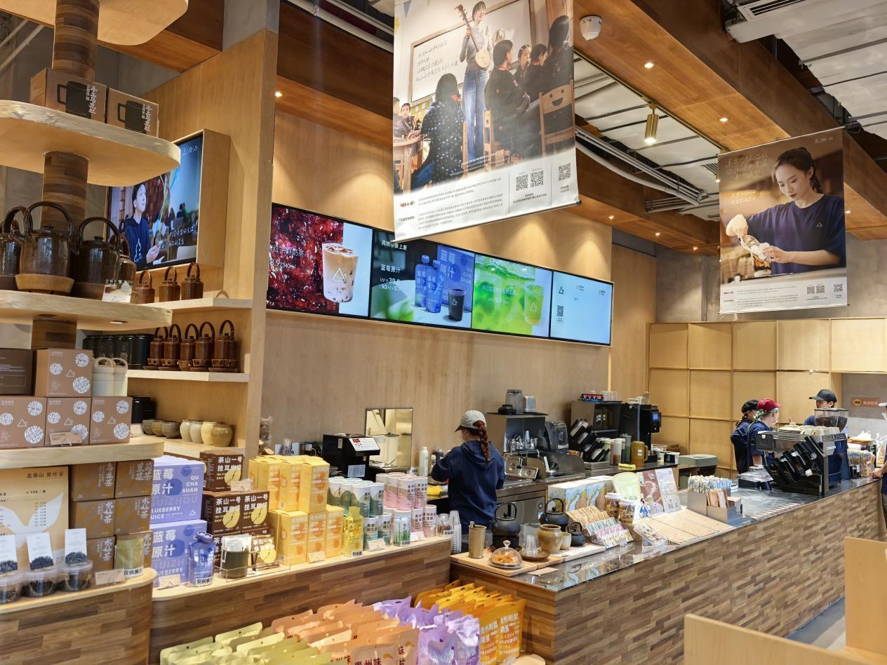 在初冬和煦的阳光下,门店内充斥着融融暖意。一进门,目光就被“彩茶趣·声声不息”主题海报所吸引,暖黄色灯光洒在侗乡孩童的笑脸上,彩色音符飘绕于画幅,配合着店内悠扬播放的联名公益宣传片,“在出山的路上,你为我风雨兼程……”轻快的旋律,伴着纯净的童声和空灵的侗族大歌和声,温情在空气中流动。