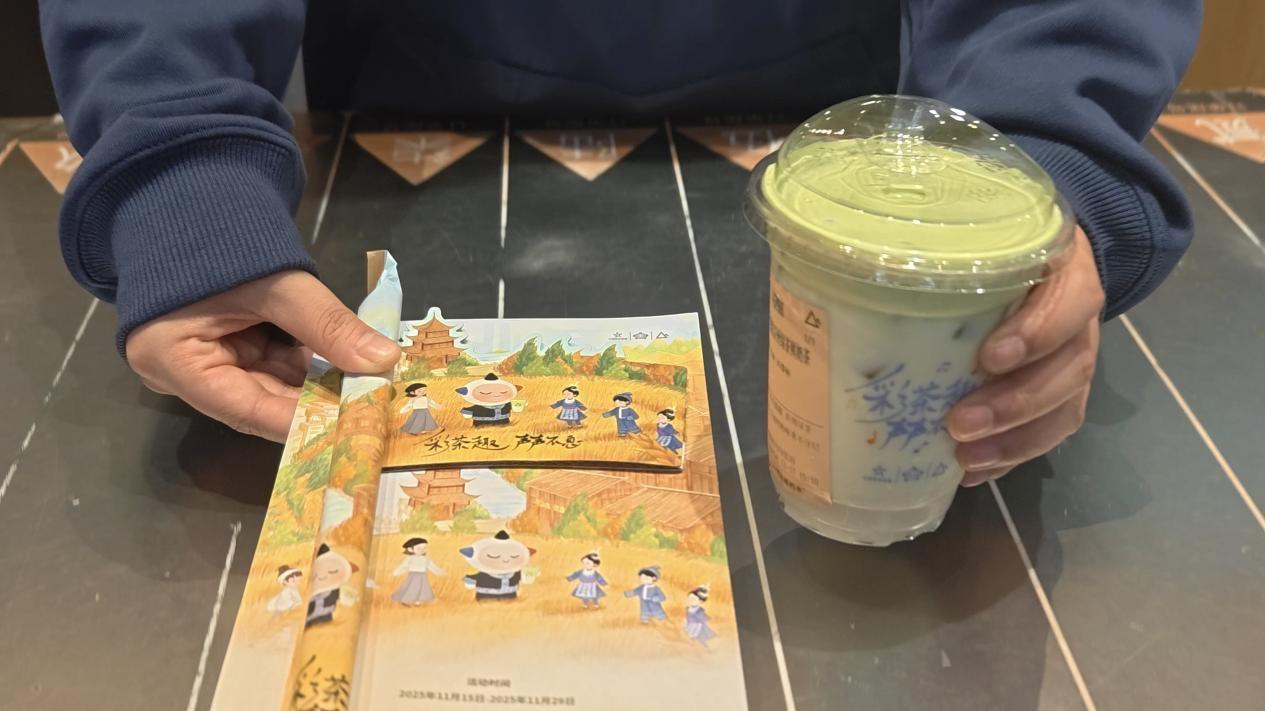 “您好,这是您的黔东南香禾糯糯贵州绿茶鲜奶茶,每购买一杯,我们都会向黎平县双江镇黄岗小学捐赠2元,用于侗族大歌传承教育。”店员每将一杯联名饮品递到顾客手中,就会带着微笑进行解释。刚拿到奶茶的彭睿端详着杯套上的手绘图案说:“店员推荐了这杯新品,既能喝到特色奶茶,又能为文化传承出份力,这种公益方式挺有意义。”