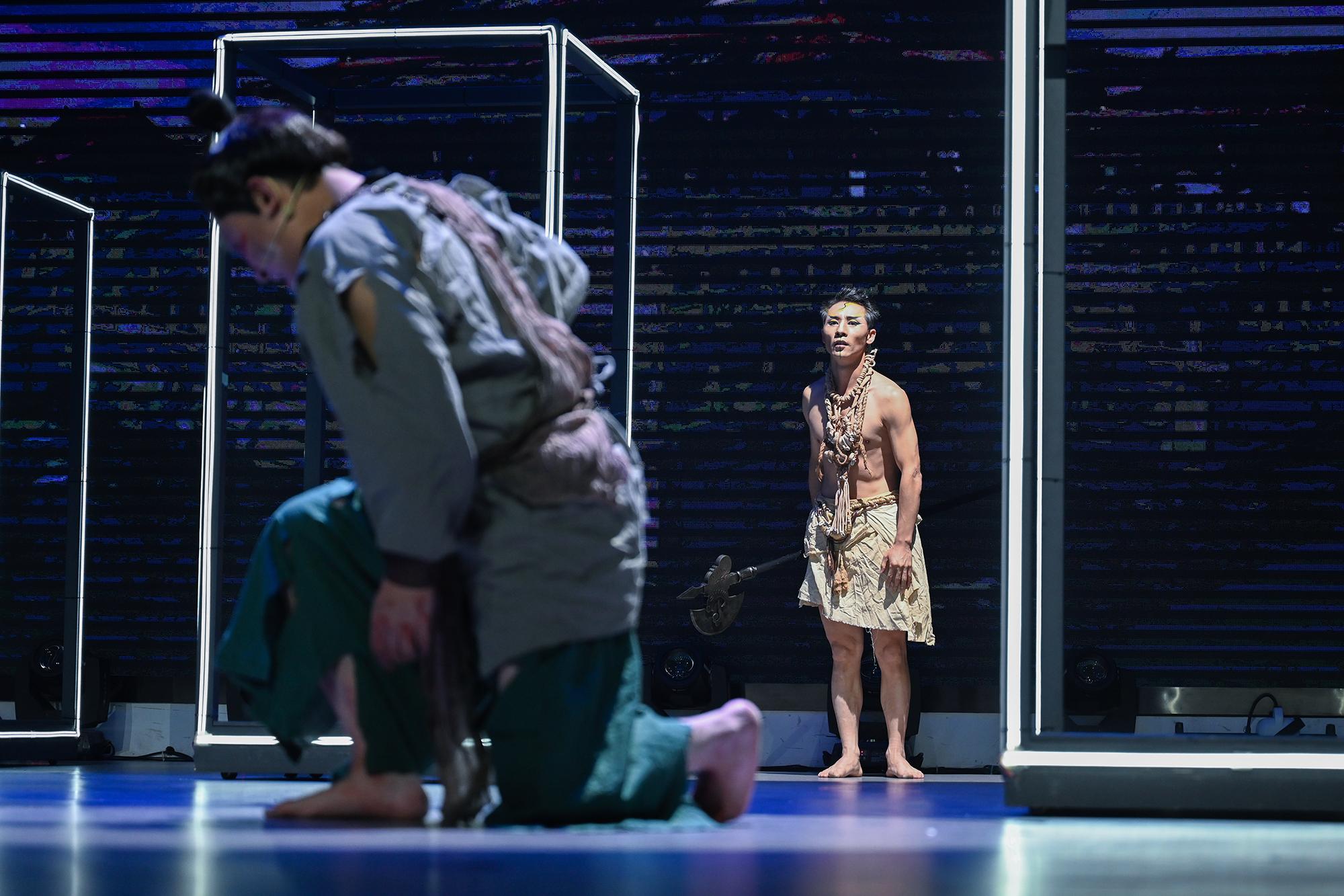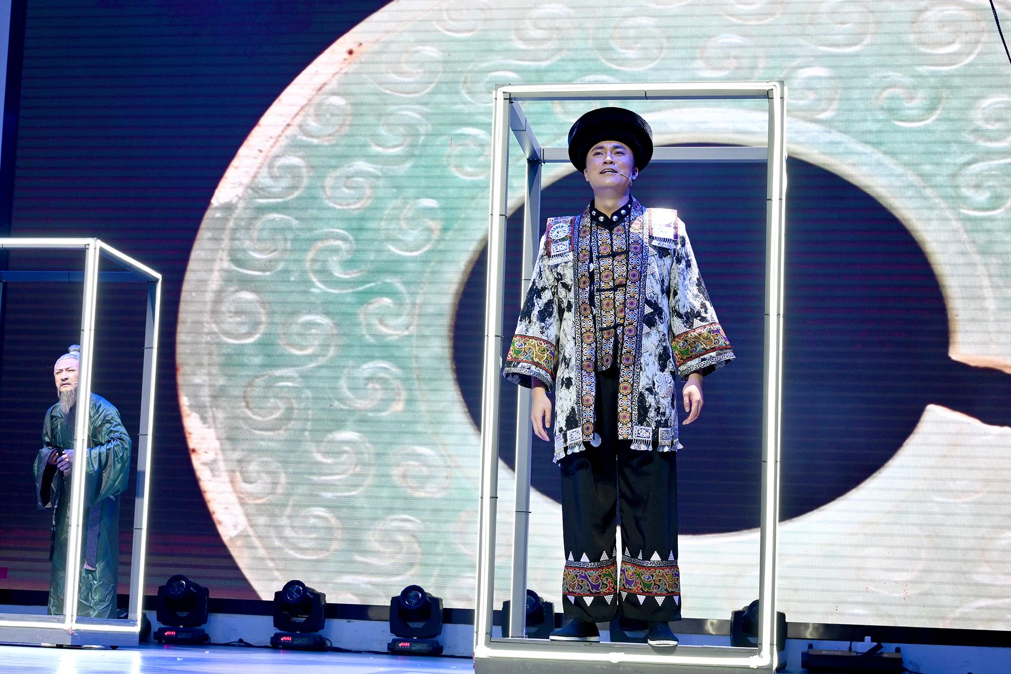 在赫章可乐的群山深处,一口羽人纹饰铜钺,沉默了两千余年。如今,它在舞台上被赋予声音与心跳。《事死如生》没有复原考古现场,而是借一位夜郎青年之眼,望向山外的世界:父亲带回的玉玦,采药人讲述的城池,自己凿山开路却坠崖身亡。最终,族人以“套头葬”送别这位勇者——铜釜覆面,不是终结,而是灵魂穿越器物通道、通往另一个世界的启程。这场葬礼,既是对个体的哀悼,更是夜郎文明对未知世界隐秘而执着的向往。