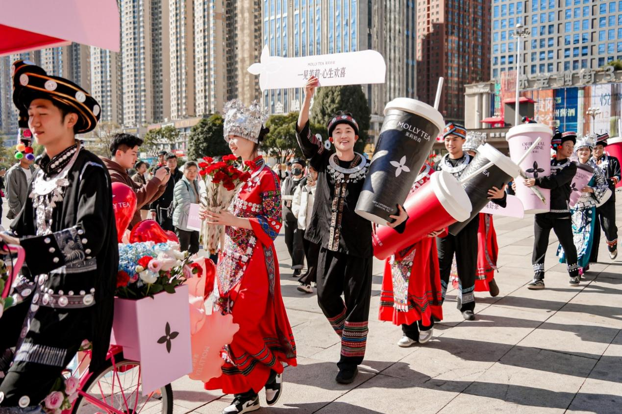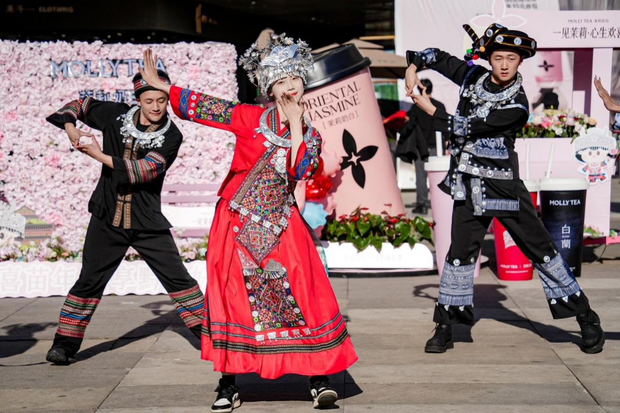 通过一周的预热,本次活动在11月29日迎来新一波高峰。在花果园购物中心的活动现场,身着苗绣、戴着苗族盛装的青年男女,与现代舞演员同台演绎的“苗年大狂欢互动巡游”队伍在苗银叮当与茉莉香氛交织中,将苗族芦笙舞、飞歌等非遗元素与茶饮消费场景带到游客身边。活动现场气氛火爆,单日累计参与互动人数超1.2万人次,相关话题#欢喜苗年#在各大社交平台刷屏,全网曝光量突破500万人次。