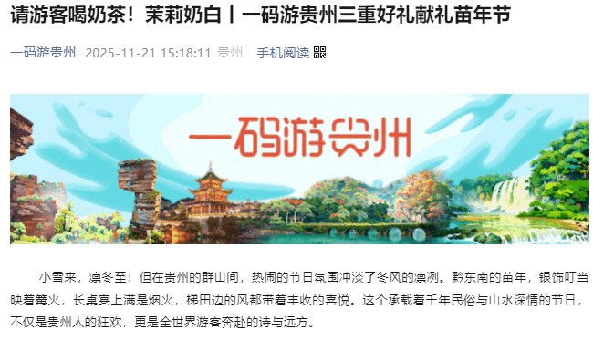 据了解,此次活动自11月22日起便已在全省范围内率先启动,茉莉奶白在各市(州)线下终端与“一码游贵州”等平台同步启动预热。活动与正在火热进行中的贵州苗年系列活动与品牌产品进行有机结合,通过“限定产品+沉浸体验+专属权益”等多重模式,实现民族文化传播与在地消费拉动的双重突破,为新消费与文旅产业深度融合提供鲜活样本。
