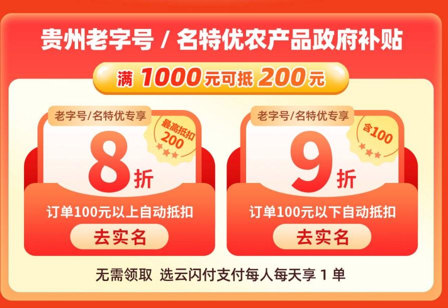 消费者需通过“一码贵州APP”或小程序完成实名认证,进入“多彩贵州欢乐购·黔味惠万家”线上专区选购产品。使用“云闪付”支付即可立减(无需领券):消费金额100元(含100元)以下享9折优惠,100元以上享8折优惠,优惠金额最高不超过200元。每人每天仅限享受1次优惠,数量有限,先到先得,用完为止。