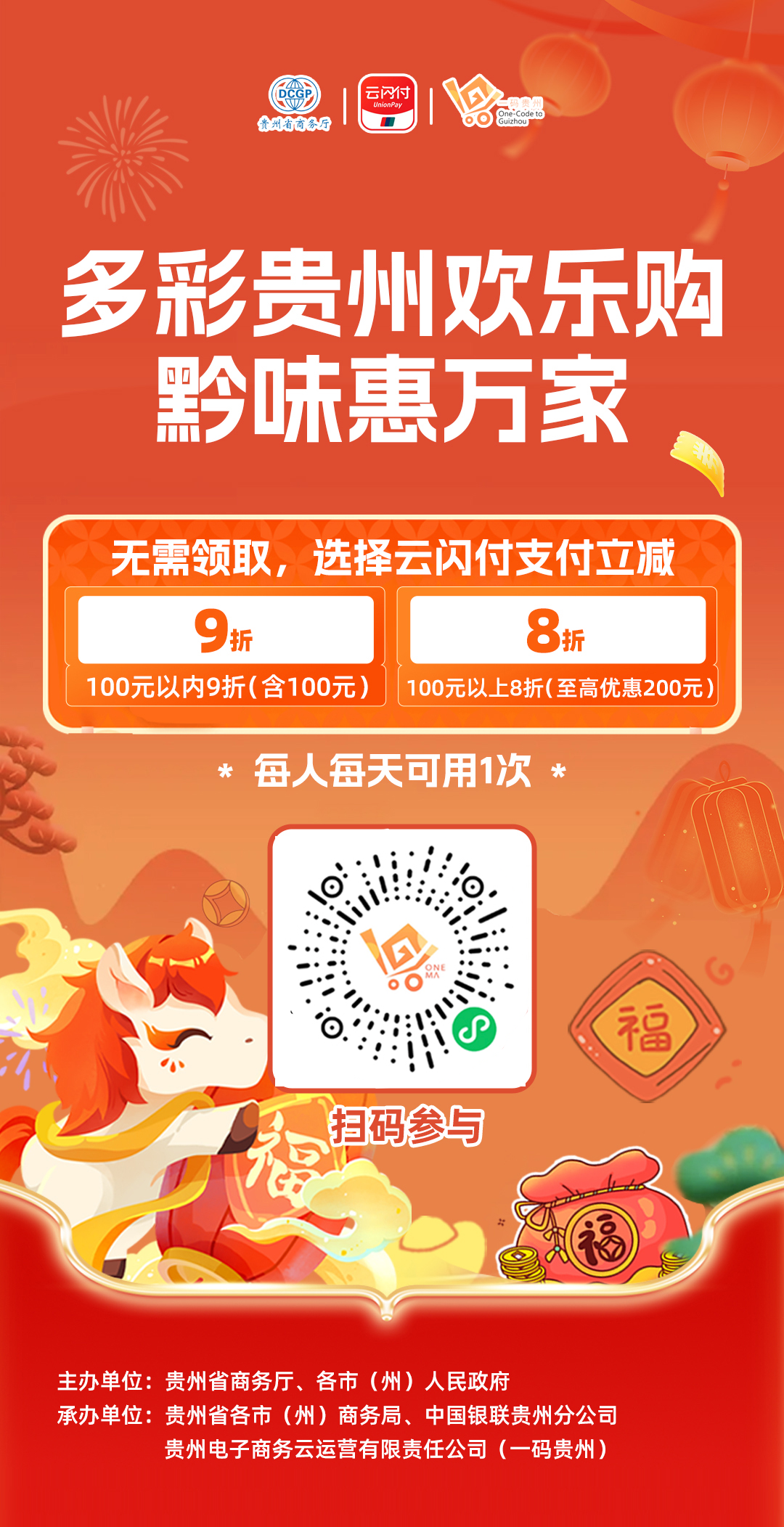 为进一步激发消费潜力,推动贵州老字号及名特优农产品创新发展,由贵州省商务厅、各市(州)人民政府主办,贵州省各市(州)商务局、中国银联贵州分公司、贵州电子商务云运营有限责任公司(一码贵州)承办的“2026年多彩贵州欢乐购·黔味惠万家”消费券活动将于1月16日正式启动。