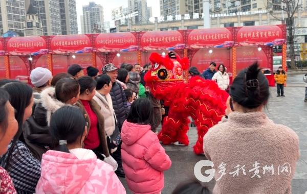 另一边,非遗及民间文艺展演区也热闹上演。苗族斗脚舞的表演欢快热闹、温水小手拳身法灵活,同时,一场精彩的仡佬族高台舞狮(龙狮灯舞)表演将现场气氛瞬间点燃,只见金红双狮随着鼓点腾挪跳跃,一只狮子摇头摆尾地“闯”入人群,在观众席间穿梭逗趣,俯身与围观市民亲昵互动,引得阵阵欢笑与惊呼。