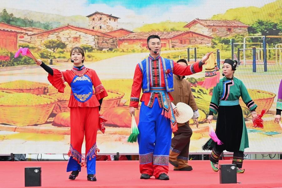 活动现场,高亢悠扬的地戏唱腔与醇厚鲜香的屯堡美食相映成趣,预热环节中,高台地戏、打粑粑体验、新春送福(送春联)、美食品鉴、屯堡大碗茶品尝及非遗展示等活动同步开展;启动仪式上,《屯堡请茶歌》《地戏魂》《烟雨至江南》《故乡千里望》等节目轮番上演,屯堡花灯歌舞剧《婚事新办》将移风易俗理念融入民俗演绎,现场还设置了屯年系列、移风易俗相关的有奖互动问答环节,并举行西秀区旅游志愿者授旗仪式,让八方宾客沉浸式体验六百年大明遗韵与高原山水交融的独特魅力。