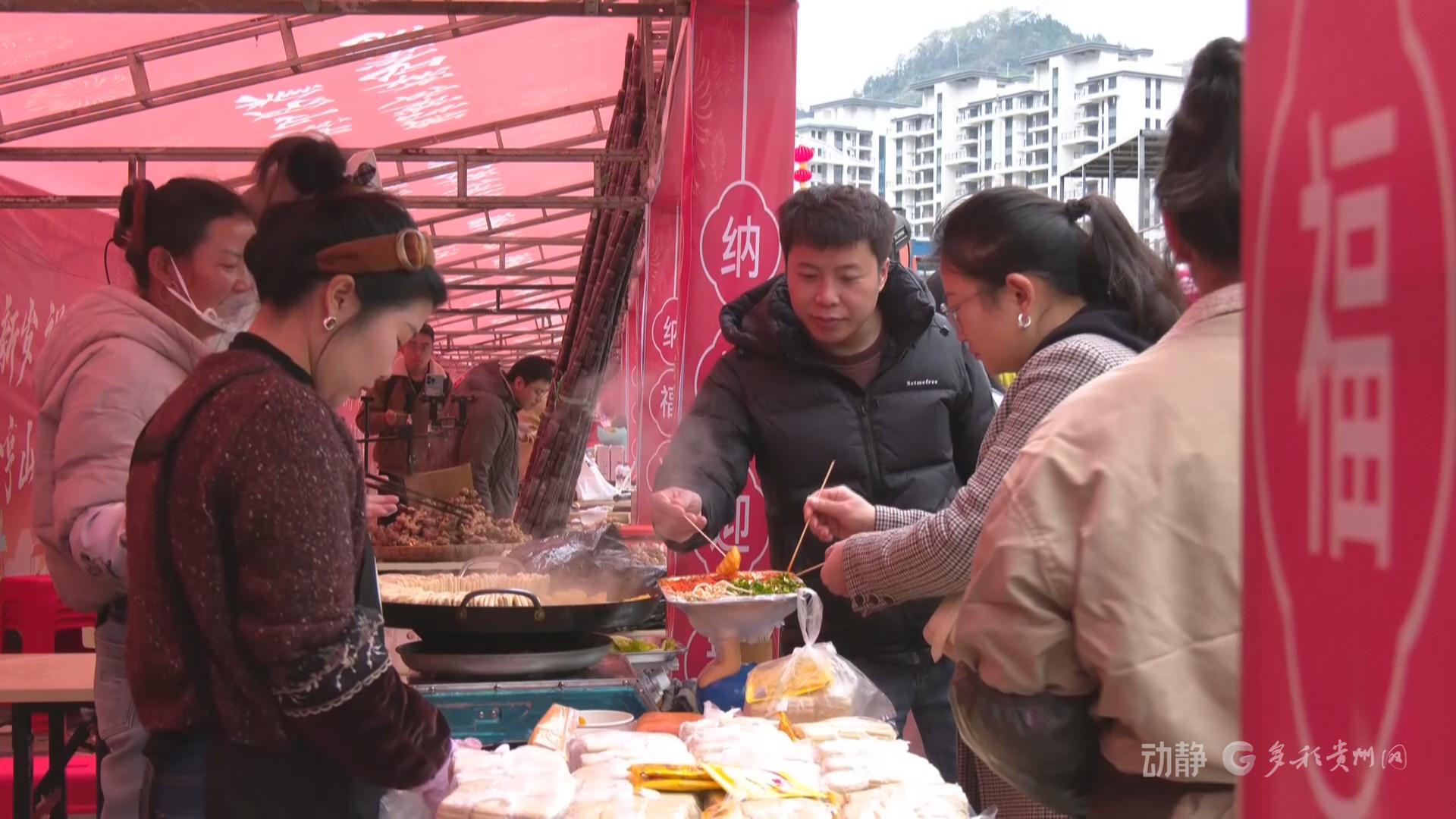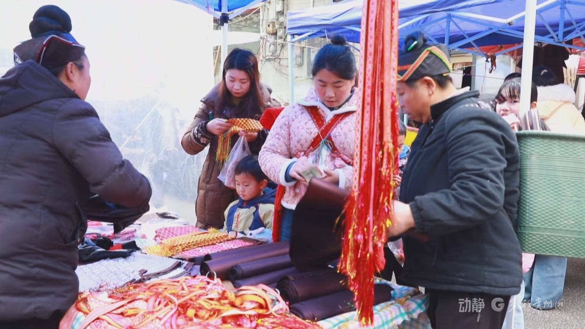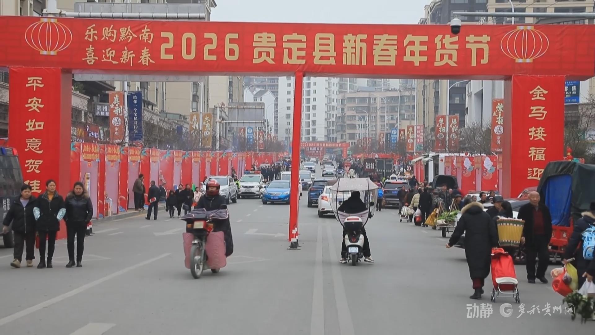 在贵定县杨柳大道,“乐购黔南·喜迎新春”年货节火热启幕。春联福字、腊肉香肠、云雾茶等传统年货与苗绣蜡染等民族手工艺品琳琅满目,吸引群众争相选购。