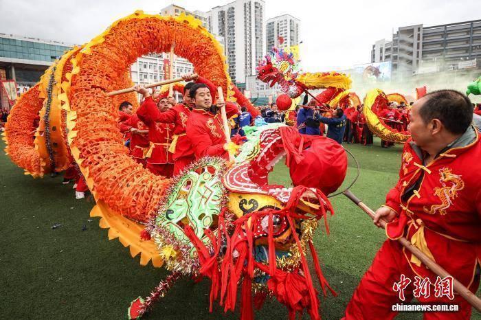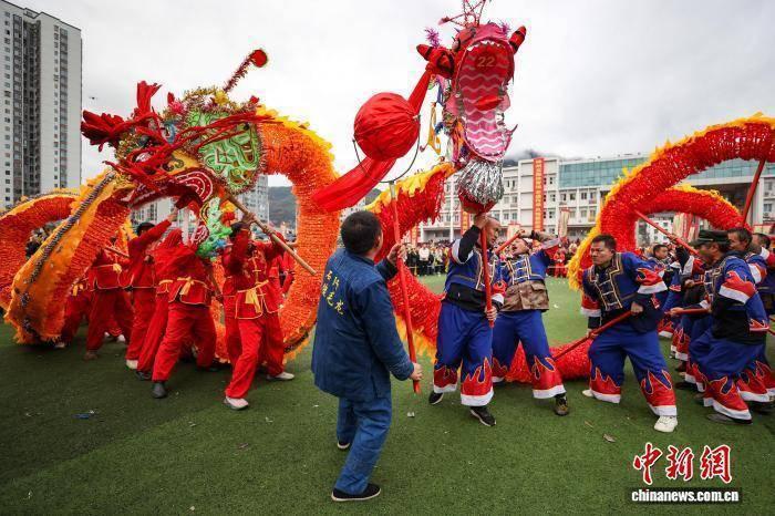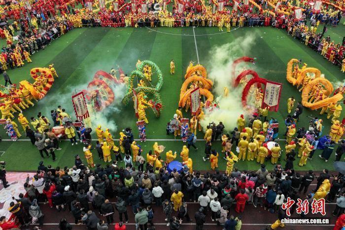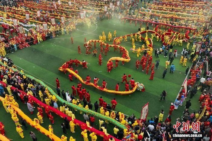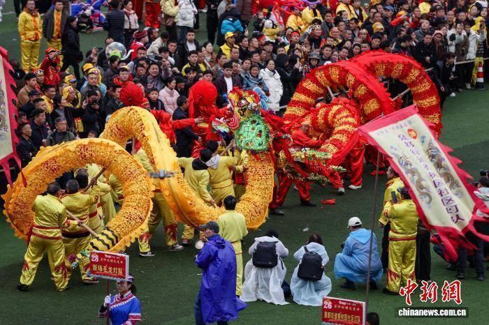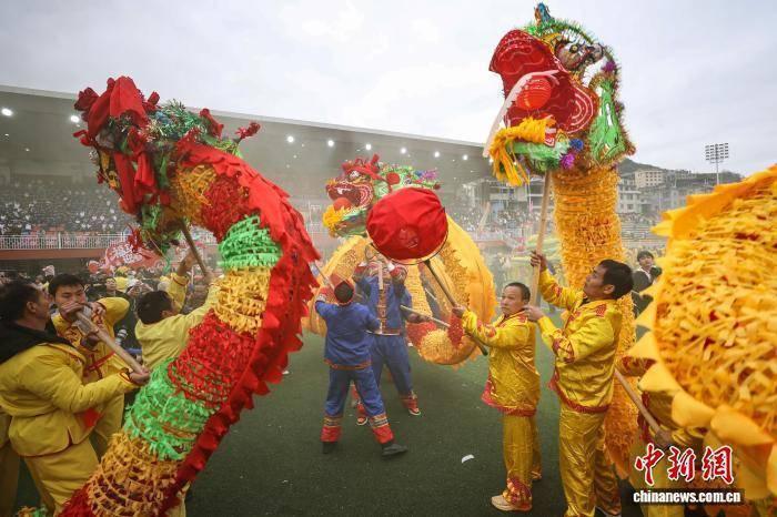 2月27日,航拍“仡佬毛龙节”现场。当日,贵州省铜仁市石阡县“仡佬毛龙节”在该县体育场举行,当地各村寨及参加展演的80条“仡佬毛龙”齐舞贺新春。“仡佬毛龙”是石阡仡佬族世代流传下来的新春主要庆祝活动之一,期间,石阡各村寨村民就会自发组织编扎毛龙,闹新春,送吉祥。