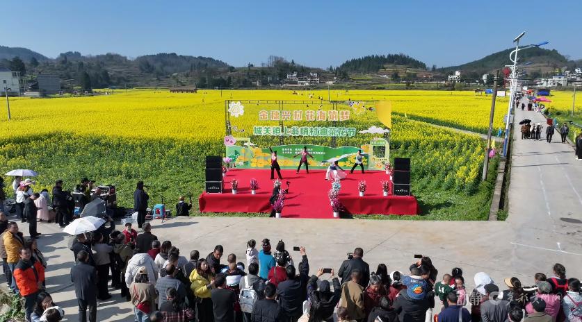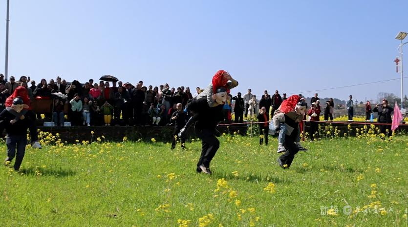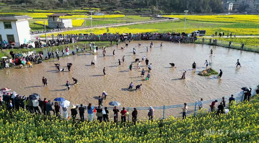 走进城关镇上翁哨坝区,上千亩油菜花竞相绽放,花香四溢。花田之间,猪八戒背媳妇、滚铁环等一个个比赛项目轮番上演。村民与游客同台竞技,在沉浸式体验中感受农耕乐趣,尽享春日美好时光。