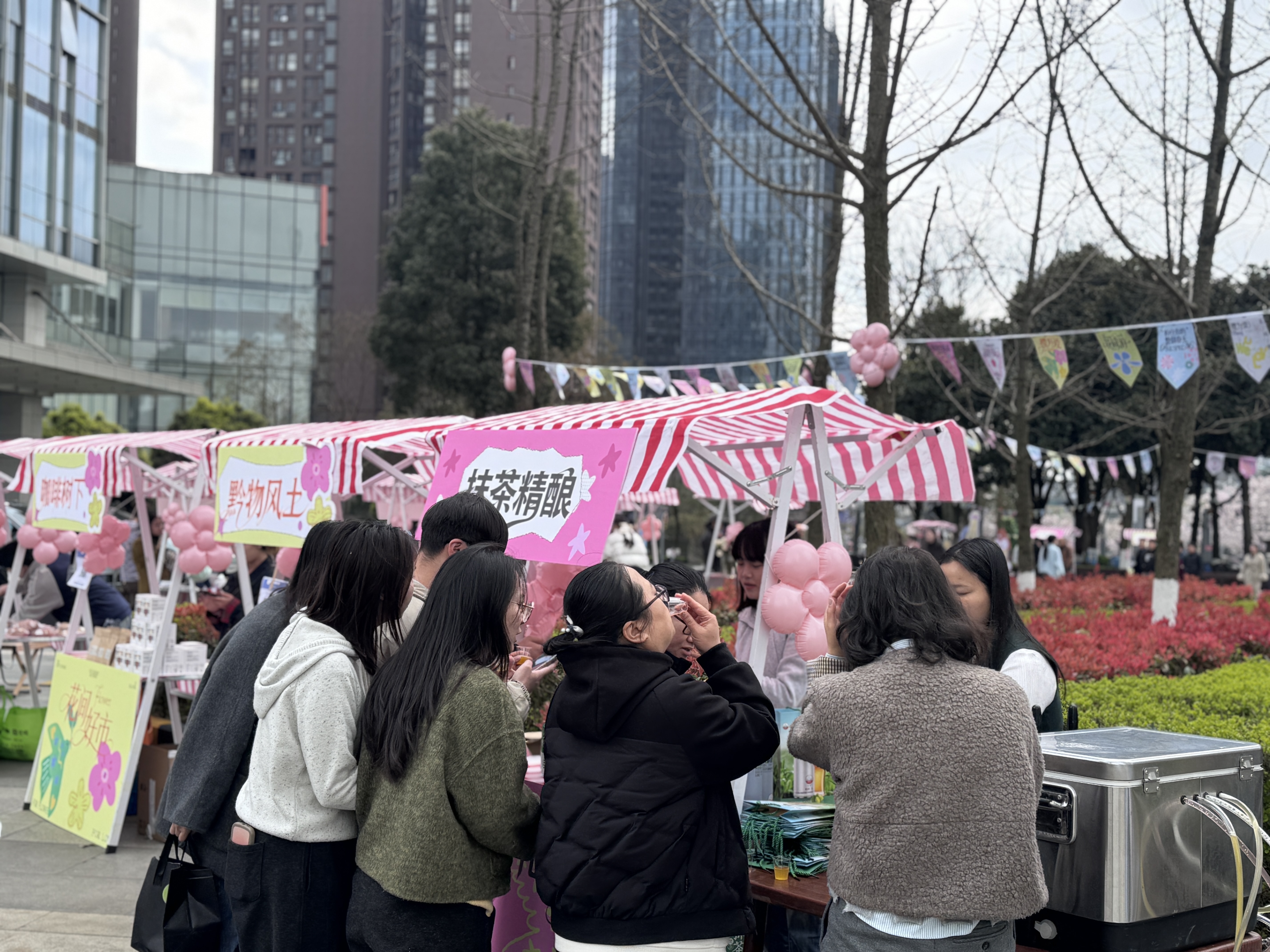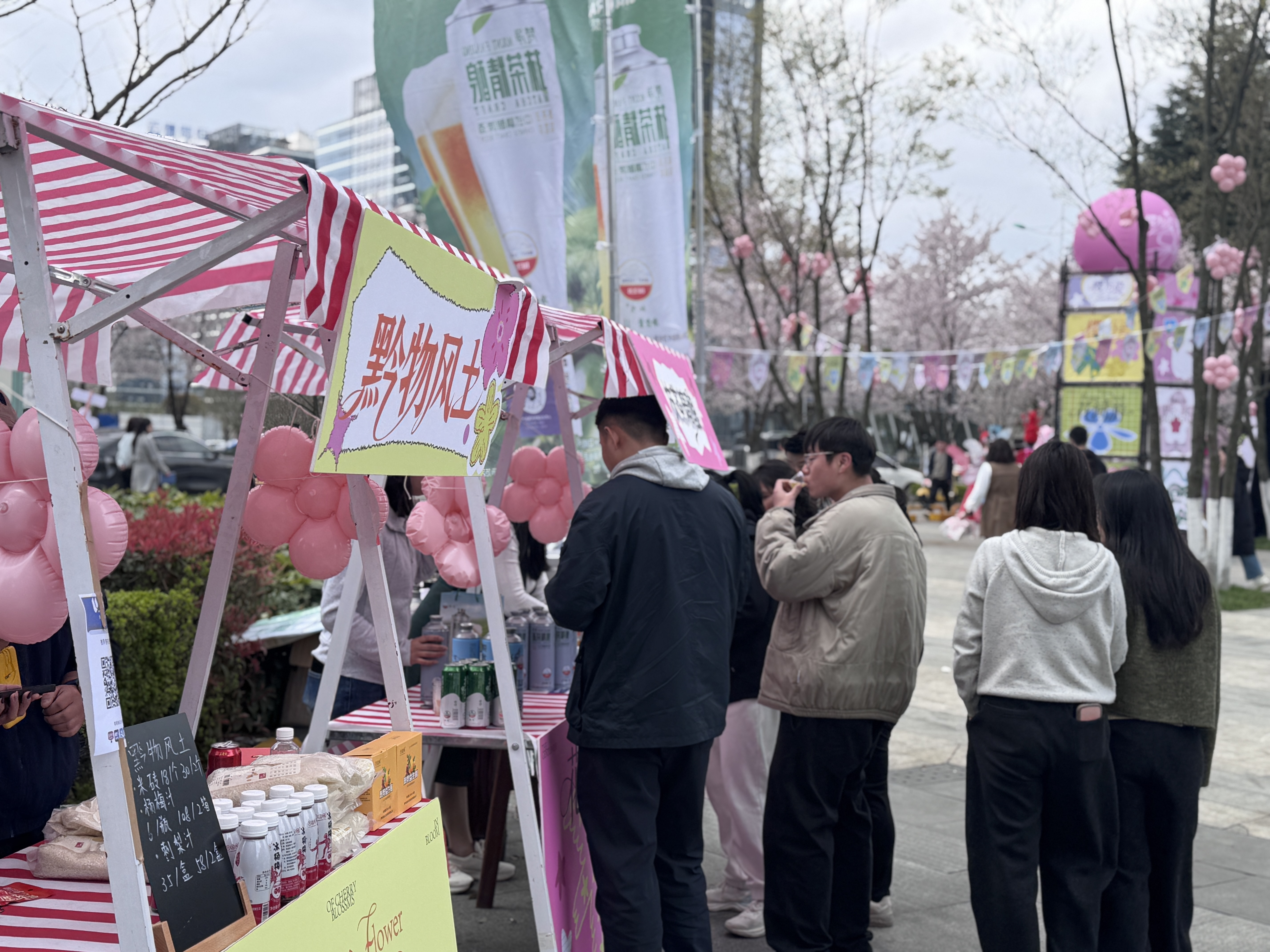 在梵净抹茶精酿摊位前,人头攒动。工作人员叶丽琼介绍,摊位结合樱花盛景打造“赏花+微醺+打卡”一体化体验,配备四头打酒机,支持即时出酒与试饮。13日活动启动至13时,已售出四十多件产品(每件6罐,单价156元/件),其中百香果口味已售罄。“大家对特色口味的精酿接受度很高,试饮环节反响热烈。”叶丽琼说,接下来,将进一步加强包装设计与视觉呈现,提升产品拍照打卡体验与品牌辨识度。