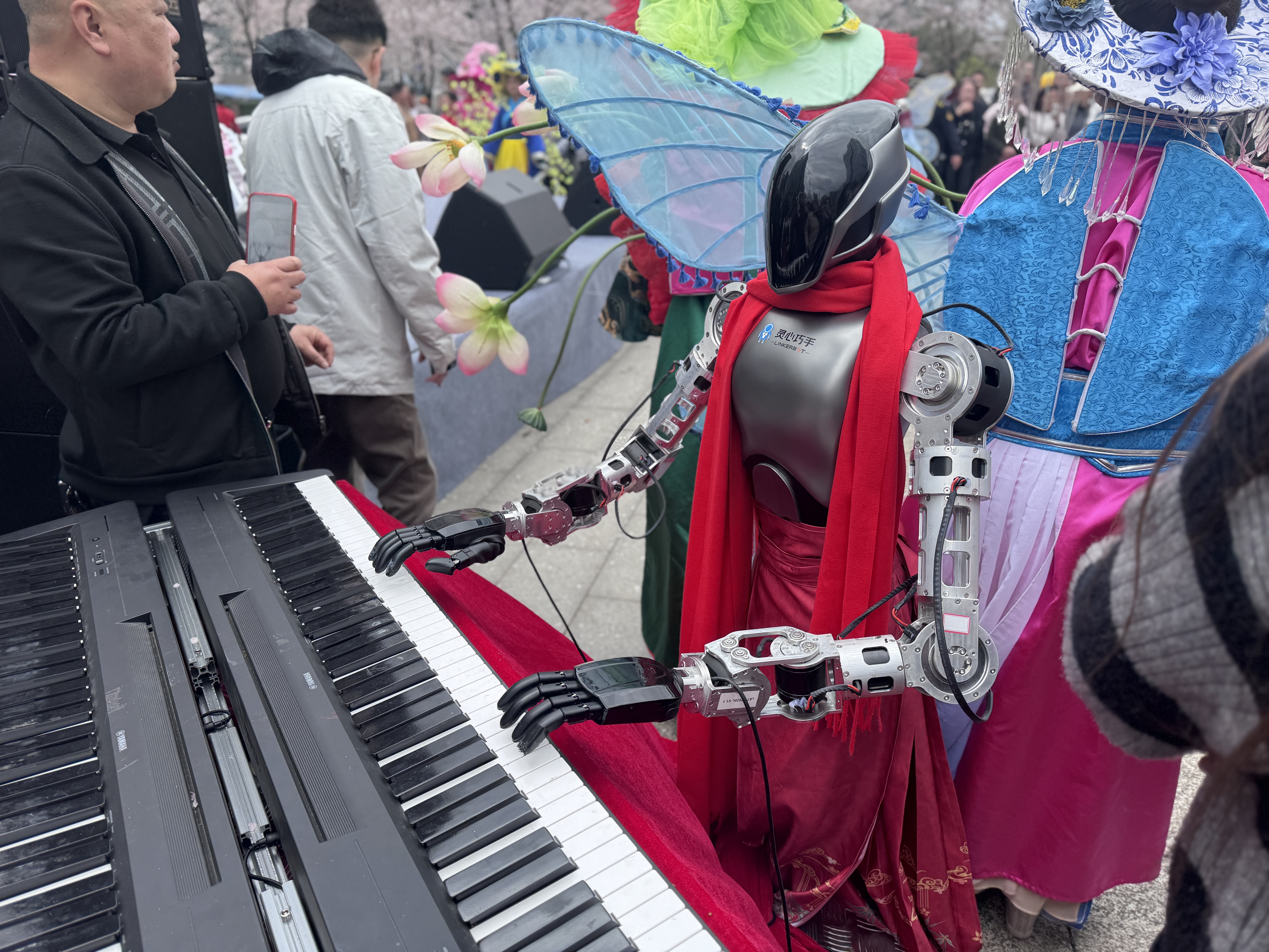 步入诚信南路,粉白的樱花缀满枝桠,微风拂过,花瓣如雪飘落。本次游园会精心设置“花间戏梦·看”“花间集令·玩”“花间好市·逛”三大主题活动板块。13日的开幕式上,机器人搭载樱花元素装饰登场,与十二位身着锦绣华服的“花神”共舞,在科技与传统的交融中奏响春日序曲。随后,“十二花神”引领现场观众沿樱花大道开启巡游,宛如流动的春日画卷。特斯拉车辆排列成樱花造型,灯光交错间绽放璀璨“樱花”。