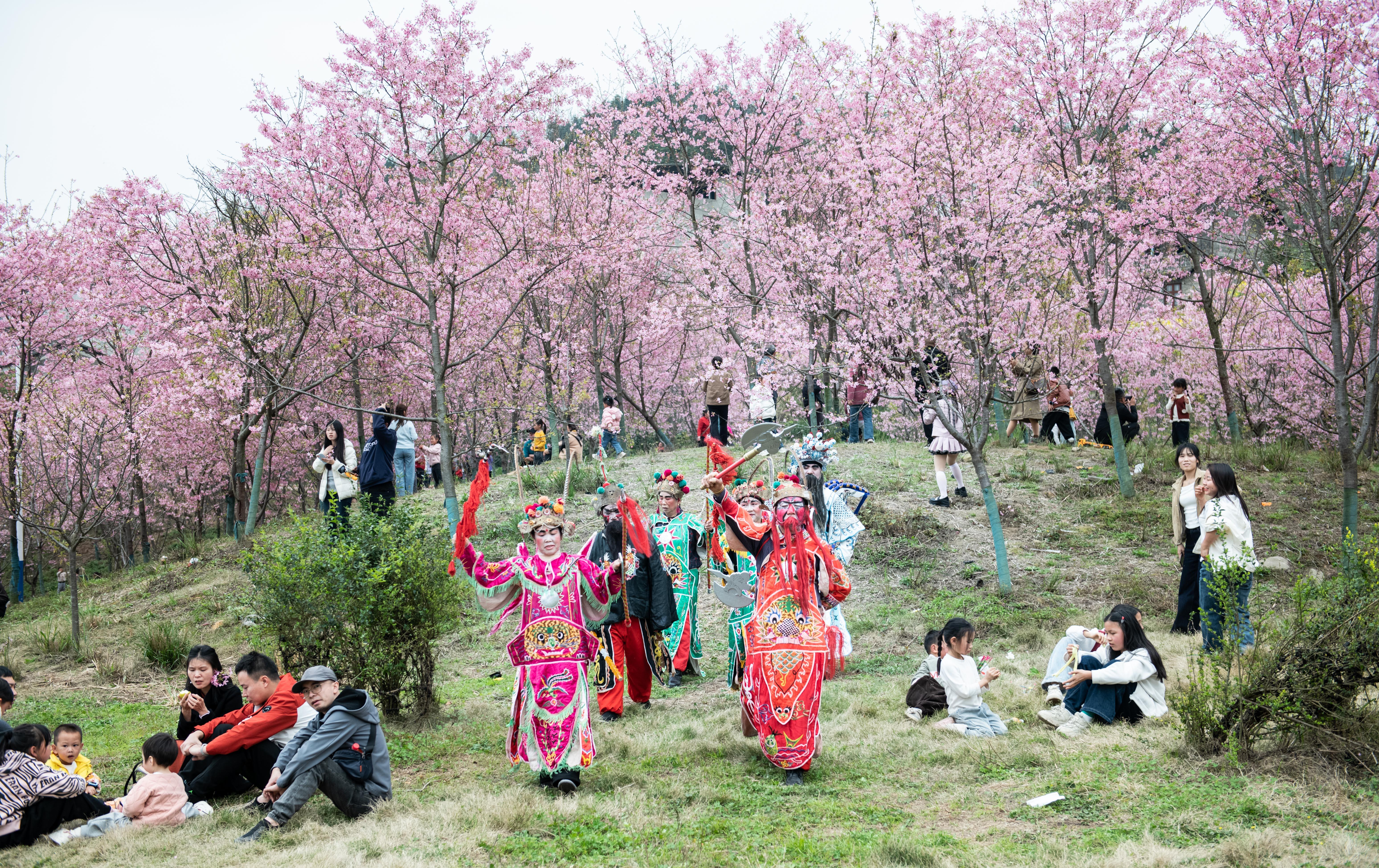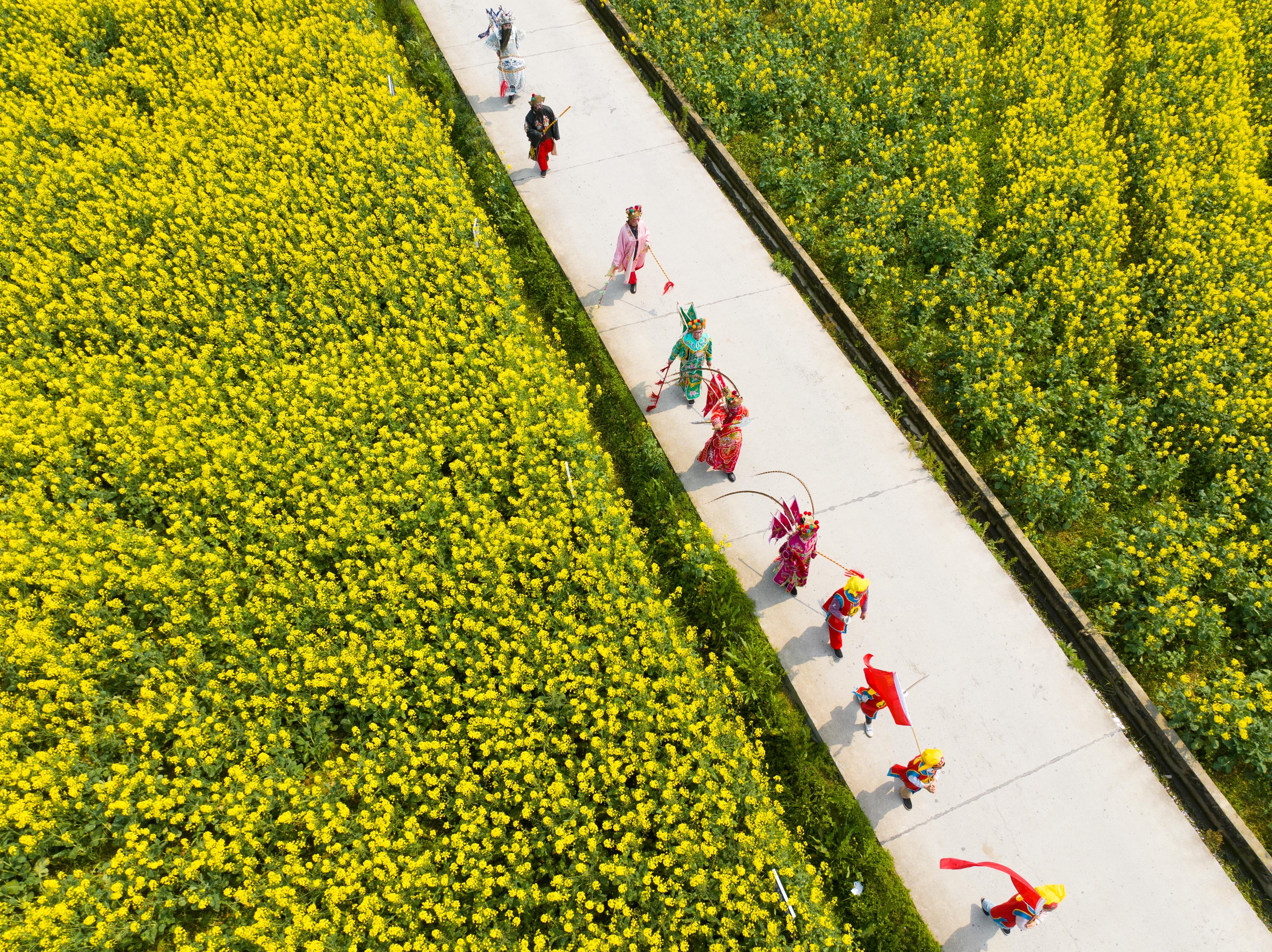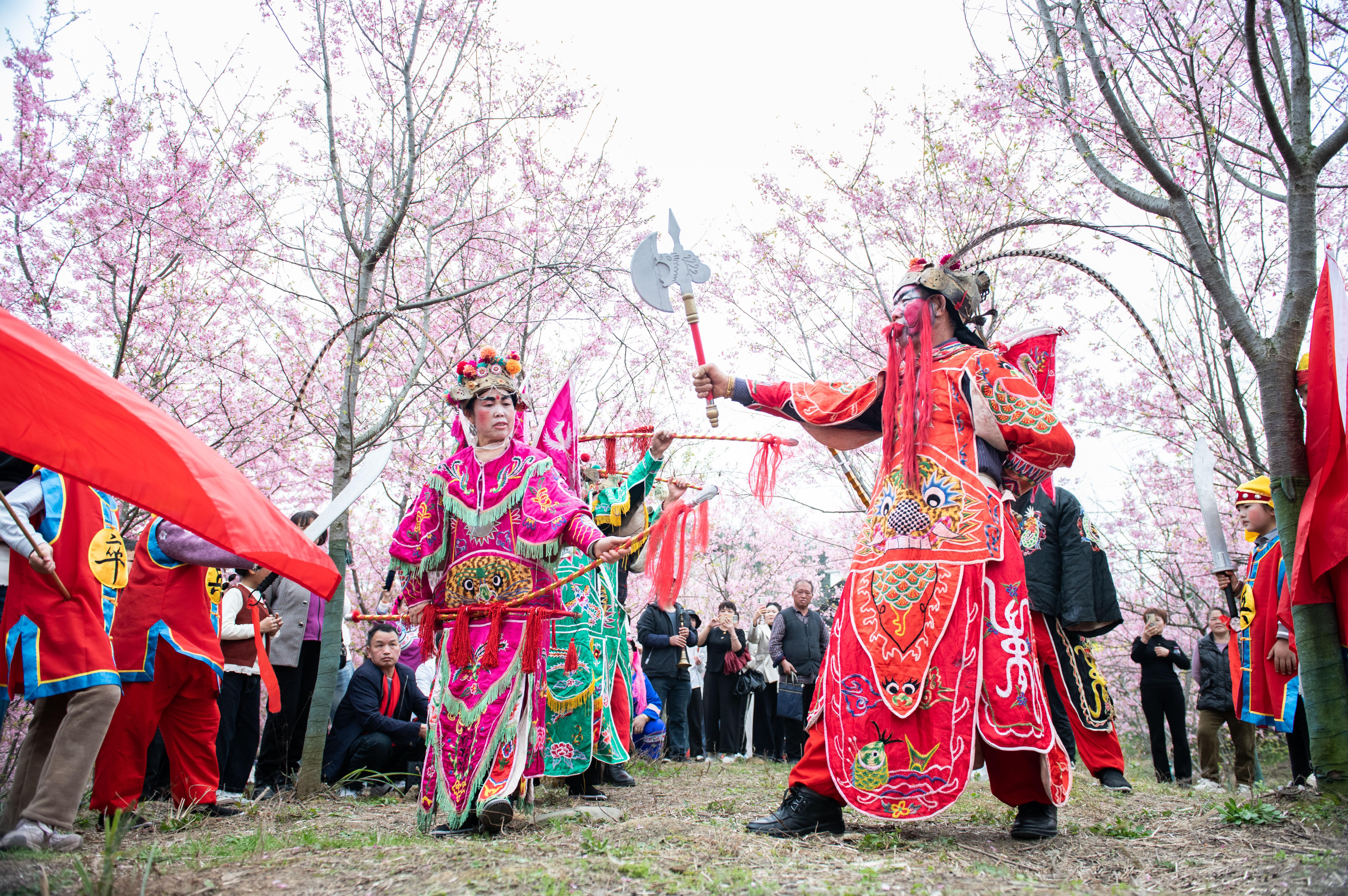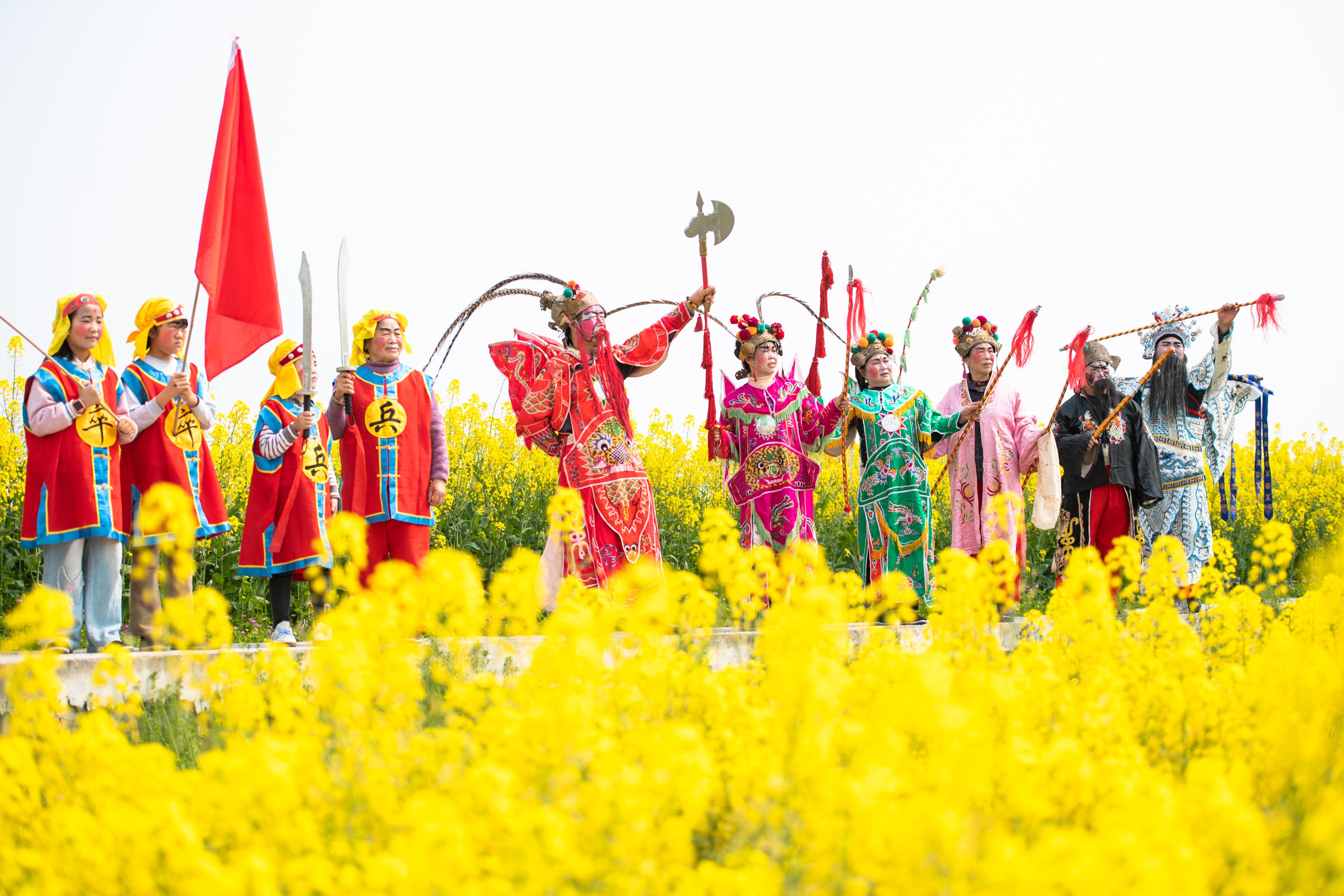在金色花田间,戏班演员们身着戏服穿越花海巡游,唱腔高亢,汉语与侗话交替,引得游客阵阵喝彩;在樱花如霞的江畔,铿锵锣鼓与飘落的花瓣相映成趣,《穆柯寨招亲》《大战长坂坡》等经典剧目轮番上演,让游客在赏花之余尽享非遗魅力。