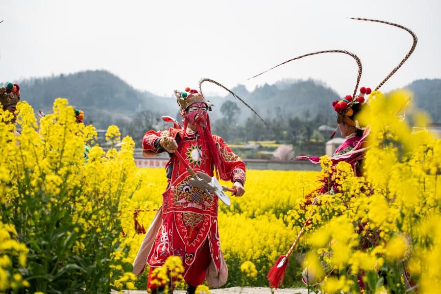 阳春三月,贵州省天柱县9.4万余亩油菜花竞相绽放,百亩樱花如云似霞。在这春意盎然的季节里,天柱平甫侗戏班走进渡马镇新民村油菜花海和白市镇辞兵洲樱花岛,以一出出原汁原味的侗族大戏,为踏青赏花的群众献上“戏韵花香”的文化盛宴。