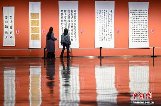 图为参观者在遵义市美术馆观看书画展览。中新社记者 瞿宏伦 摄