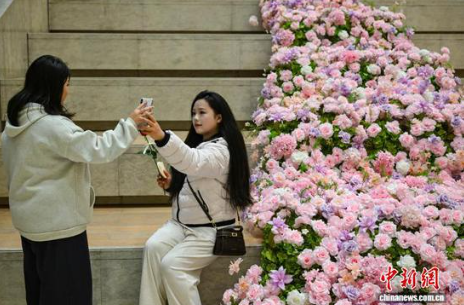图为参观者在遵义市美术馆设置的“楼梯花景”前拍照。中新社记者 瞿宏伦 摄