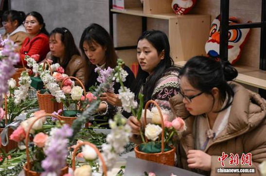 图为民众在美术馆之夜活动中体验插花。中新社记者 瞿宏伦 摄