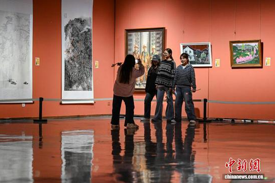 图为参观者在遵义市美术馆书画展览上合影。中新社记者 瞿宏伦 摄