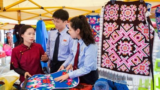 苗绣摊主向税务干部介绍苗绣产品及工艺