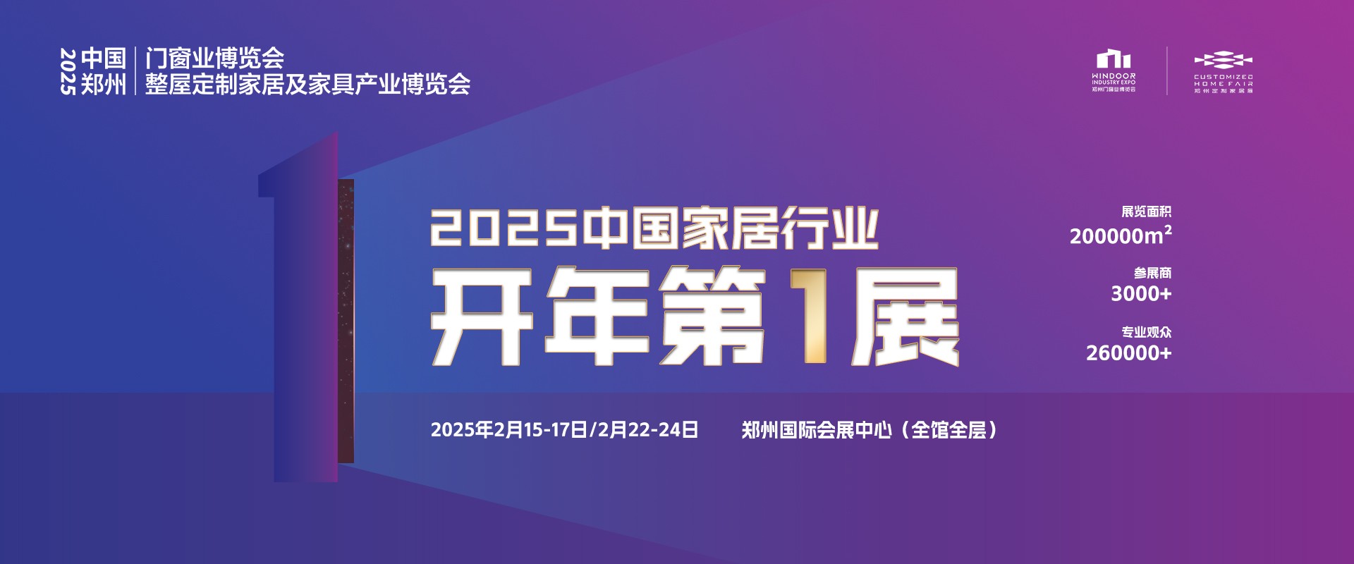 一城双展,融合共创。“2025中国郑州门窗业暨整屋定制家居及家具产业博览会”将于2025年2月15-17日、2月22-24日分两期在郑州国际会展中心盛大召开!
