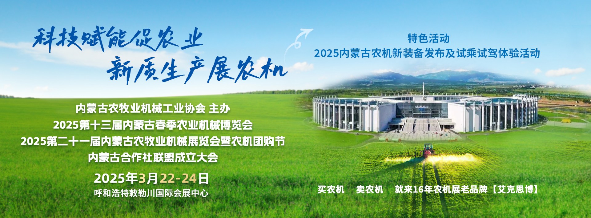 为全面落实《"十四五"全国农业机械化发展规划》及《内蒙古自治区"十四五"推进农牧业农村牧区现代化发展规划》、《内蒙古自治区"十四五"农牧业机械化发展规划》有关要求,加快推进农牧业机械化向全程全面高质高效发展,助力农畜产品生产基地优质高效转型,为保障粮食等重要农畜产品有效供给、巩固拓展脱贫攻坚成果、全面推进乡村振兴、加快农牧业农村牧区现代化提供有力支撑。由“内蒙古农牧业机械工业协会、内蒙古农牧业产业化龙头企业协会联合主办的“2025第十三届内蒙古春季农业机械博览会,2025第二十一届内蒙古农牧业机械展览会暨农机团购节、内蒙古合作社联盟成立大会、5000家合作社签到专享豪礼发放活动”同期于2025年3月22日—24日在呼和浩特敕勒川国际会展中心召开,两大展会及活动由:艾克思博国际会展(内蒙古)集团有限公司、上海博朝展览服务有限公司共同承办。诚邀农牧业机械生产和经销企业积极参展,进一步宣传和推广企业新产品、新技术、新设备。诚邀各盟市农机推广部门科技人员、农业/农机/养殖专业合作社、种养殖大户、牧场、家庭农场等经营主体观摩指导。