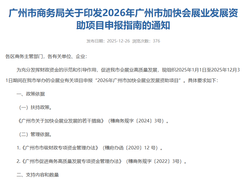 为充分发挥财政资金的示范和引导作用,促进我市会展业高质量发展,现组织2025年1月1日至2025年12月31日期间在我市举办的会展业有关项目申报“2026年广州市加快会展业发展资助项目”。